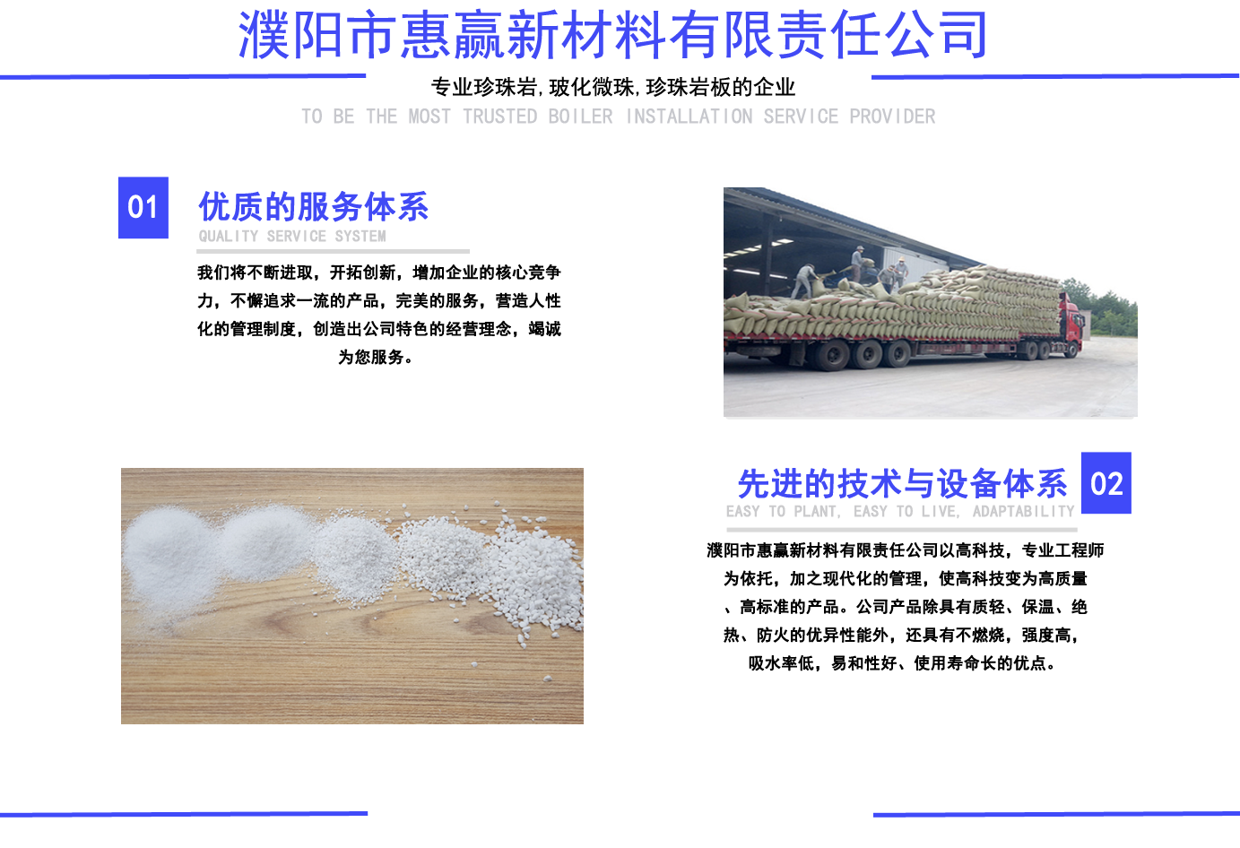 珍珠巖,玻化微珠,玻化微珠保溫砂漿, 珍珠巖板,憎水珍珠巖,憎水型珍珠巖, 憎水型膨脹珍珠巖, 膨脹珍珠巖,珠光砂-濮陽市惠贏新材料有限責任公司 公司簡介/ ABOUT